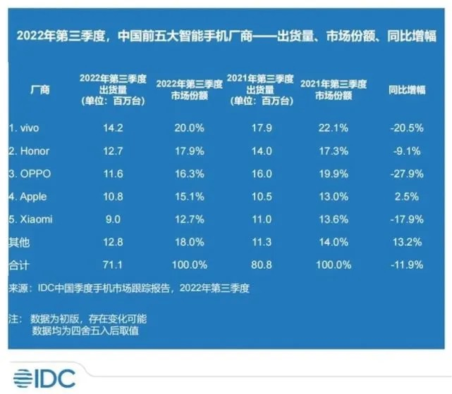 从IDC发布的2022年第三季度出货数据来看,排名前五的品牌是vivo、荣耀、OPPO、苹果、小米,市场份额分别为20%、17.9%、16.3%、151.%、12.7%。但从出货量的增幅来看,除了苹果微增外,vivo、荣耀、OPPO、小米的出货量均同比有所下降。