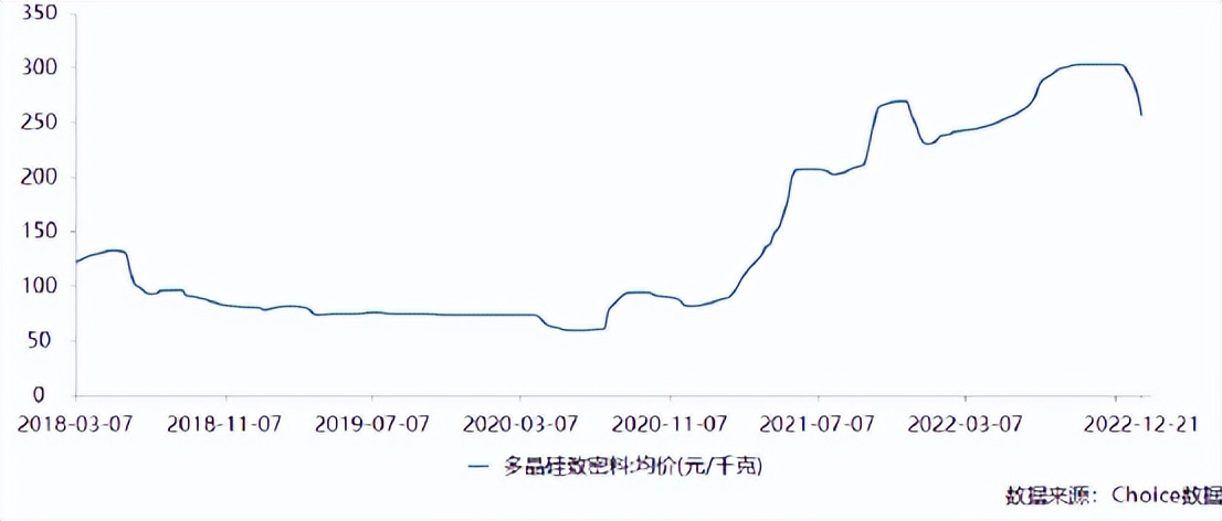 目前来看,多晶硅致密料价格确实已经逐渐临近拐点,根据2022年12月21日最新的多晶硅致密料均价来看,从11月23日至今,硅料价格从顶峰的302元/千克,下跌至目前的255元/千克,均价单月下跌超过15%。目前看,持续下跌的概率已经大于反弹的概率。
