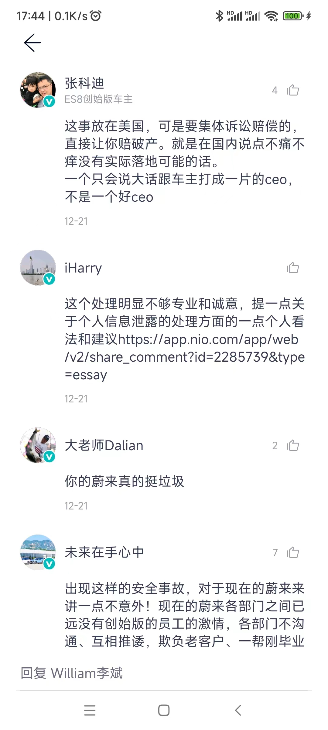 12月下旬,有黑客团队称破解了蔚来近40万用户数据,并向蔚来勒索225万美元等额比特币。当晚,李斌在蔚来社区发文致歉,承诺会为用户损失承担责任。但不少车主认为这份声明没有诚意,“这么大的事是道歉可以解决的吗?”