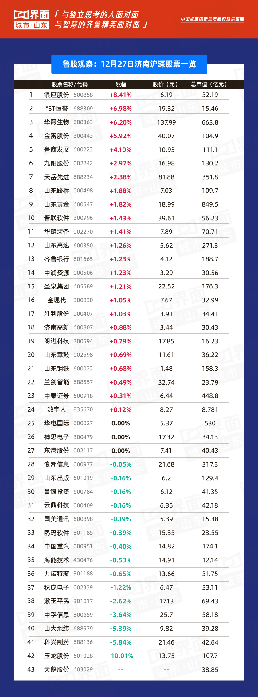 济南市涨幅榜首:银座股份(600858),涨幅8.41%,股价6.19元,总市值32.19亿元;