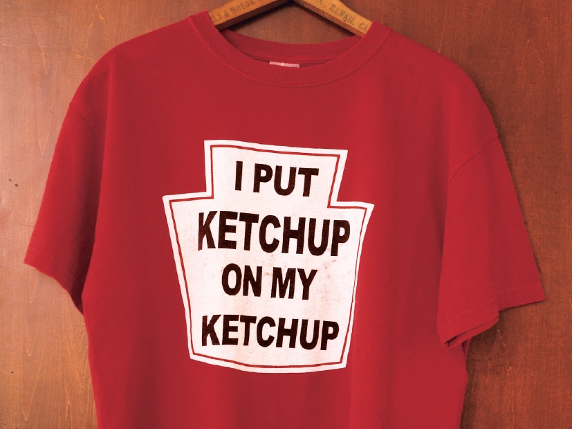 他收集了标有I put ketchup on my ketchup(我在番茄酱上也要挤上番茄酱)的美国T恤——T恤的制造商是美国番茄酱公司,并觉察到这理由有一股乐观明朗、无意反思的美国精神,“才不管什么精明老练呢!老子爱怎么活就怎么活。”美国的实感通过这件衣服传达出来,穿这件衣服在美国街头常有人来打招呼,而这样的事在欧洲就不会发生。坐在汉堡店里喝冰凉银子弹、听着周围客人吵嚷与杯盘碰撞,村上认为,只有这样才能实实在在地感受到来了美国。