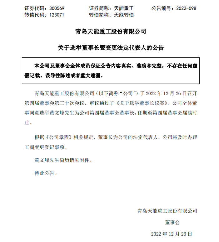 12月26日,天能重工发布公告,公司全体董事同意选举黄文峰为董事长,并变更为公司法定代表人。任期至第四届董事会届满时止。