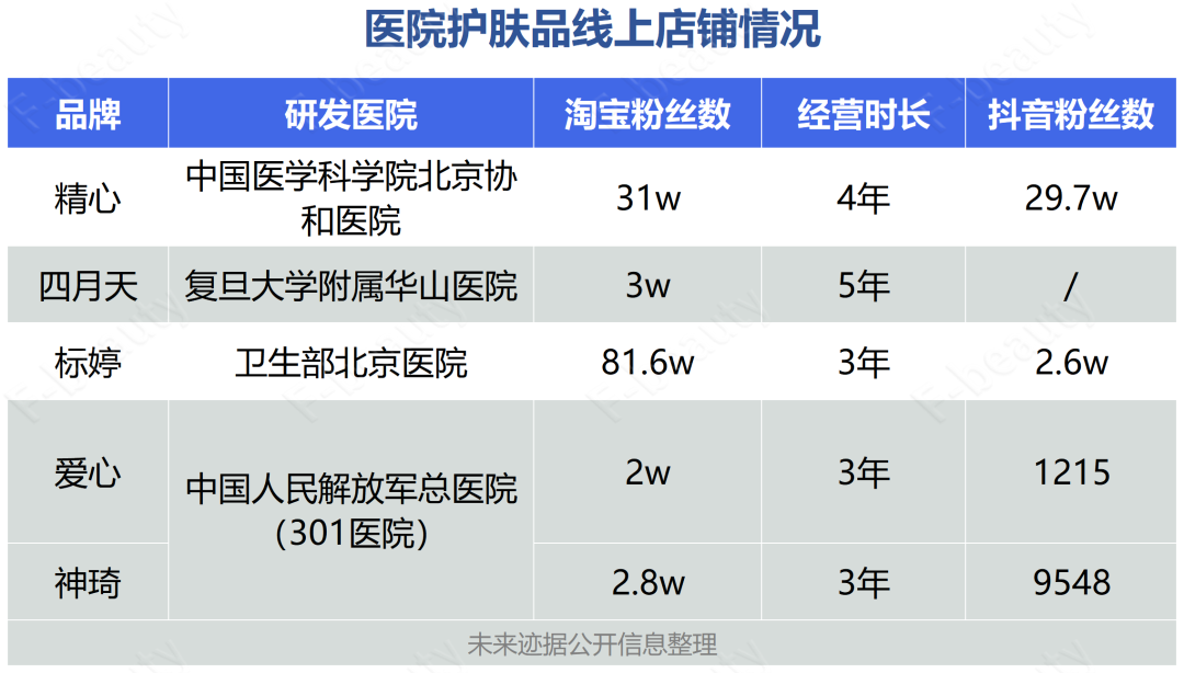 此外,《未来迹Future Beauty》注意到,北京协和医院出品的护肤品牌“精心”、中国人民解放军总医院出品的护肤品牌“神琦”等“医院品牌”,也都早早地进驻了抖音平台,并在平台上进行直播带货。