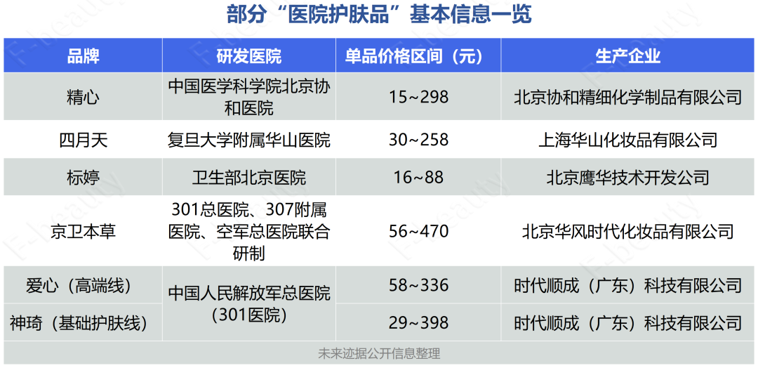 此外,爱心、301、神琦的生产企业时代顺成(广东)科技有限公司前身为解放军总医院时代日化厂;精心是由北京协和医院的全资企业——北京协和精细化学制品有限公司进行生产销售;四月天的生产企业上海华山化妆品有限公司,则是由上海华山医院直属的上海华山康健医疗有限公司以及广东中山侨光实业公司共同投资创办。