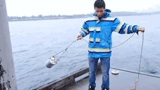 测试员将iPhone 7和三星Galaxy S7 一起放进一个四面漏孔的铁桶,然后把它丢进十多米深的河里(用绳子上的刻度测量水深),静置五分钟。