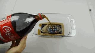 4.把手机放进可乐里冰冻12小时,然后用锤子砸开可乐冰坨,取出手机。
