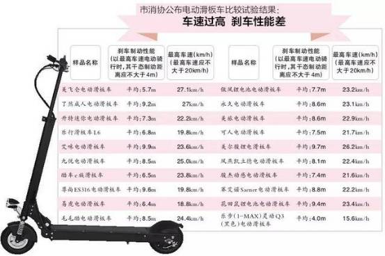 北京市消费者会发布电动滑板车比较试验结果。结果显示,电动滑板车存在车速过快、刹车不灵、蓄电池容量达不到明示标准等问题。