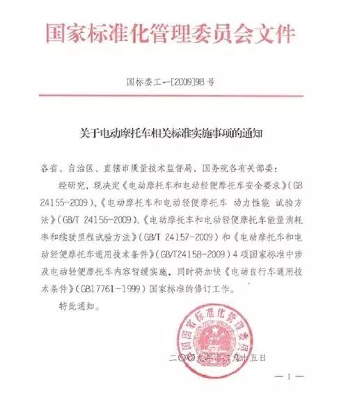2009年12月15日,国家标准委《关于电动摩托车相关标准实施事项的通知》:“经研究,现决定<电动摩托车和电动轻便摩托车安全要求>(GB 24155-2009)、<电动摩托车和电动轻便摩托车动力性能试验方法>(GB/T 24156-2009)、<电动摩托车和电动轻便摩托车能量消耗率和续驶里程试验方法>(GB/T 24157-2009)和<电动摩托车和电动轻便摩托车通用技术条件>(GB/T24158-2009)4项国家标准中涉及电动轻便摩托车内容暂缓实施……”。