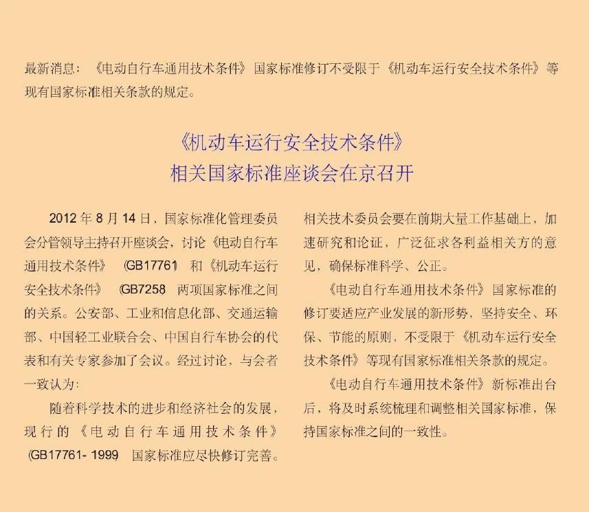 2012年8月14日,根据国家标准委专门召开关于《机动车运行安全技术条件》座谈会,讨论《电动自行车通用技术条件》和《机动车运行安全技术条件》两项国家标准之间的关系,公安部、工业和信息化部、交通运输部、中国轻工业联合会、中国自行车协会的代表和有关专家参加了会议。与会各方达成共识:电动自行车新国标的修订不受限于《机动车运行安全技术条件》等现有国家标准相关条款的规定,在《电动自行车通用技术条件》新标准出台后,国家标准委将及时梳理和调整相关国家标准,保持国家标准之间的一致性。