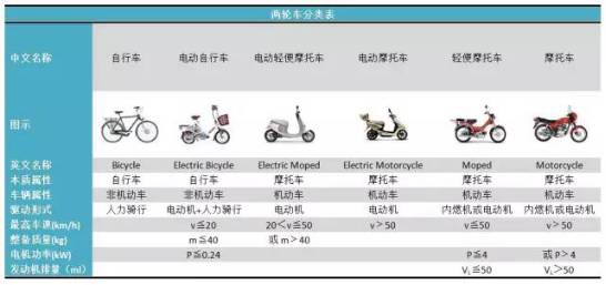 电动两轮摩托车又可细分为电动两轮摩托车和电动两轮轻便摩托车。依据《电动摩托车和电动轻便摩托车通用技术条件》(GB/T 24158-2009),电动两轮摩托车是指由电力驱动的,最高设计车速大于50 km/h的两轮摩托车;而电动两轮轻便摩托车是指由电力驱动的,最高设计车速大于20km/h且不大于50km/h,或整车整备质量大于40kg且最高设计车速不大于50km/h的两轮摩托车。