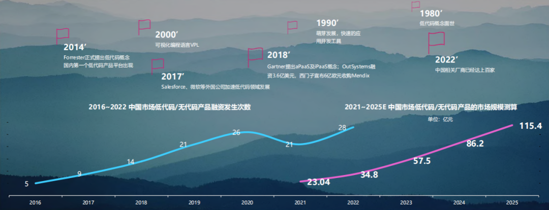 2018年,西门子收购低代码企业Mendix、美国低代码独角兽企业Outsystems获得1.5亿美元的融资,这两个事件的发生将低代码市场带入资本方的视野,中国低代码市场也在此时进入发展期。