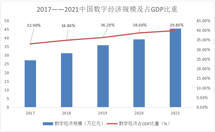 根据中国信息通信研究院发布的报告,2021年中国数字经济规模达到45.5万亿元,同比名义增长16.2%,占GDP比重达到39.8%。数字经济在国民经济中的地位更加稳固、支撑作用更加明显。