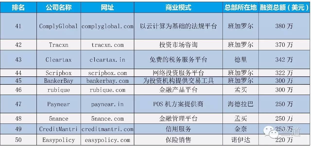 排名前50的印度互联网金融初创中有21家公司将总部设在孟买,其他公司则分别在班加罗尔(11家)、金奈(6家)、古尔冈(3家)、诺伊达(2家)、海德拉巴(2家)、德里(2家)、斋蒲尔(1家)、艾哈迈达巴德(1家)、圣马特奥市(位于美国,1家)。