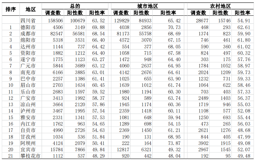 除攀枝花市、宜宾市外,其他19个地区感染率均超过50%,感染率排前五位的为德阳市、成都市、绵阳市、达州市和资阳市。其中城市地区感染率为65.42%,农村地区感染率为54.91%。183个县(区、市)中,有24个感染率大于等于70%;164个感染率大于等于50%。