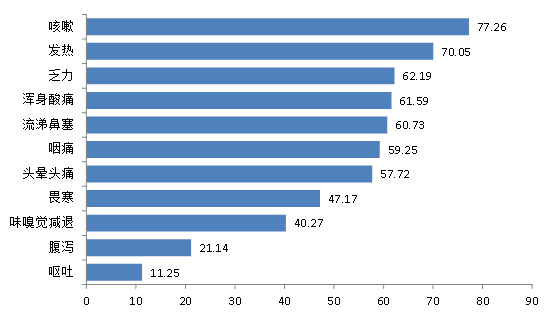 调查者中,临床症状以咳嗽、发烧、乏力和浑身酸痛、流涕鼻塞为主。122464人有发生不同程度的咳嗽,咳嗽发生率为77.26%。根据基础疾病患病情况分析,患有慢阻肺、其他呼吸道疾病的人咳嗽超过10天的比例更高。从年龄分布来看,12岁以下儿童咳嗽多在5天以内,大部分在3~10天间,65岁以上老年人咳嗽超过10天的比例略高。