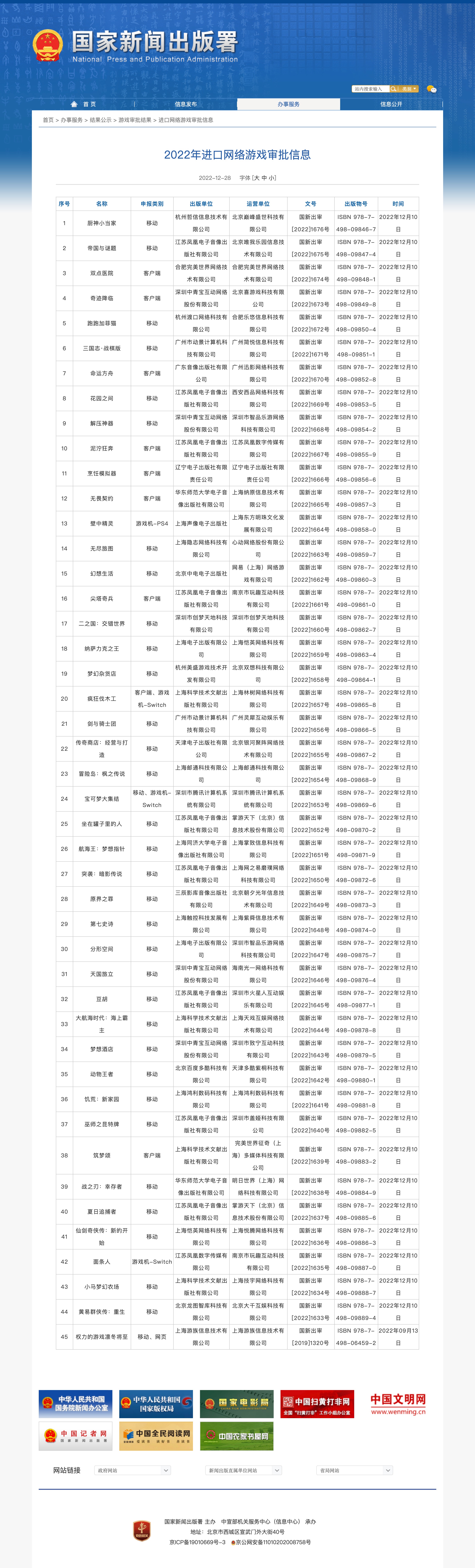 12月28日,国家新闻出版署发布2022年进口网络游戏审批信息,共45款游戏获批,腾讯的《宝可梦大集结》在列。