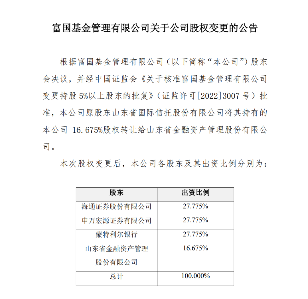 12月28日,富国基金发布股权变更公告,根据公司股东会决议并经中国证监会批准,公司原股东山东省国际信托股份有限公司将其持有的公司16.675%股权转让给山东省金融资产管理股份有限公司。