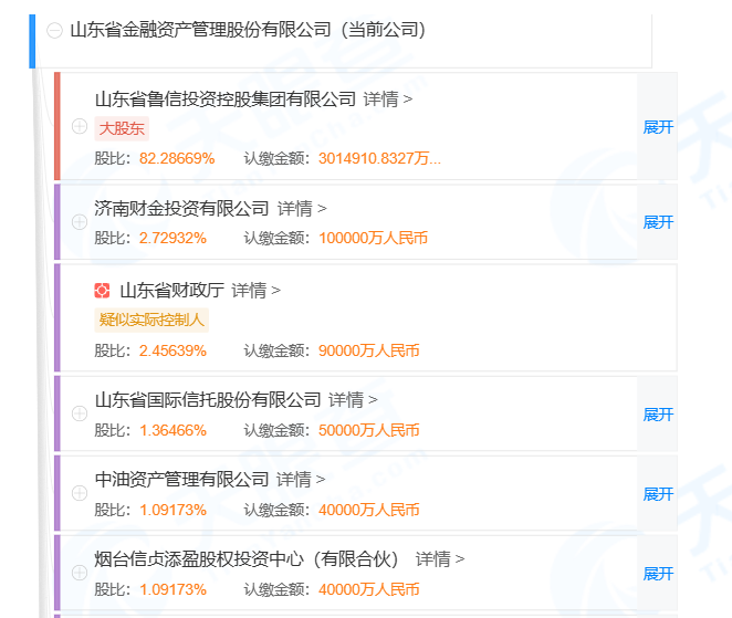 天眼查App数据显示,山东金融资产目前有24家股东,其中,此次富国基金股权转让方——山东国信也是山东金融资产的股东方之一,其持有山东金融资产1.36466%股权。山东省鲁信投资控股集团持有山东金融资产82.28669%股权,是山东金融资产的第一大股东,同时,山东省鲁信投资控股集团也持有山东国信48.1278%股权,同时也是山东国信第一大股东。