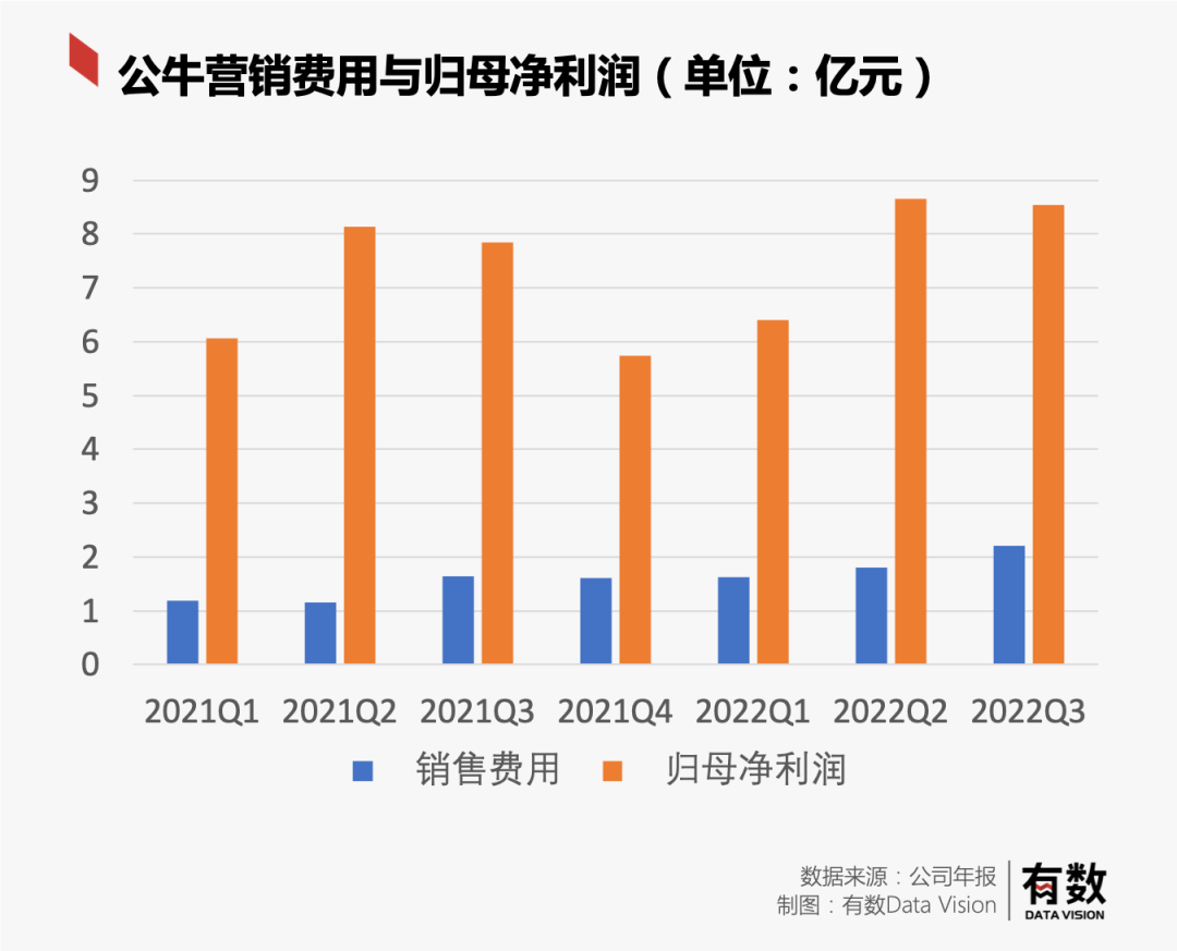 2022年第三季度,公牛的营销费用达到了2.21亿元,比前一个季度多了0.4亿,而归母净利润比前一个季度少了0.12亿。