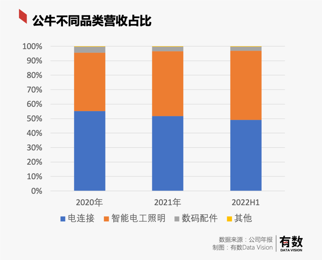 公牛在财报中称公司有三大主要业务:占比超50%的电连接(俗称插线板)、占比超40%的智能电工照明(墙壁开关插座)与个位数的数码配件。