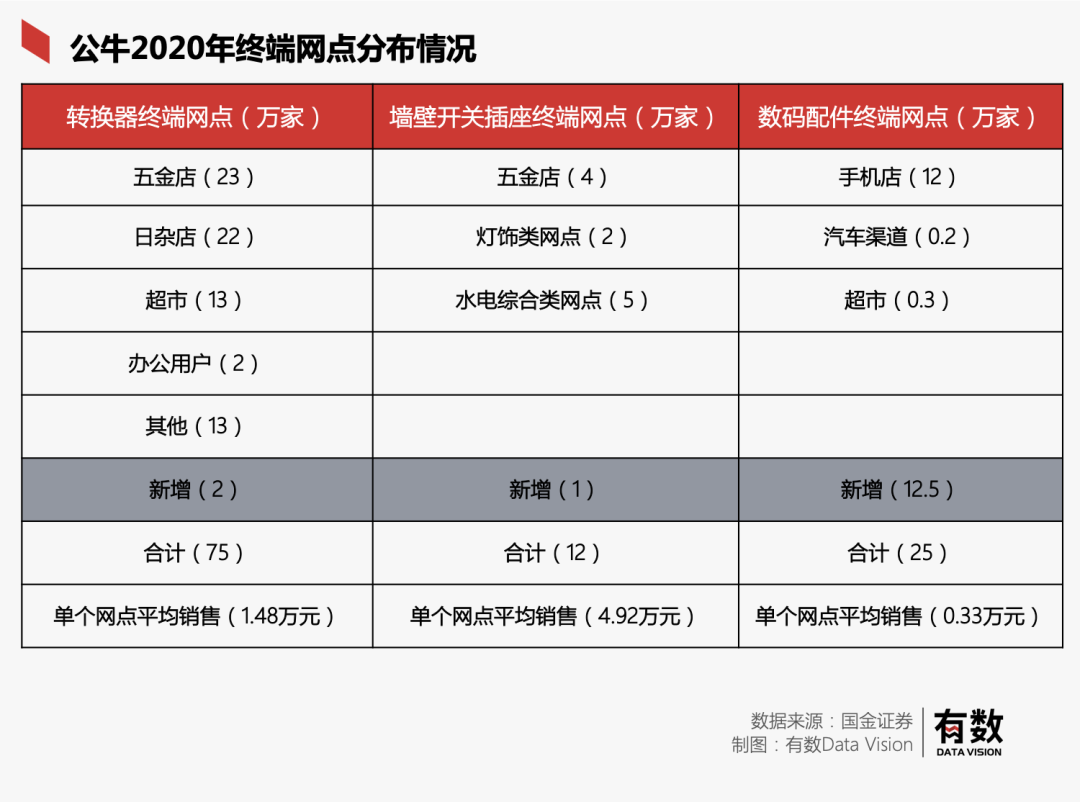 于是,公牛非但没有如预期中那样躺着收钱,反而又开始为了新产品,而特意铺设新的渠道。2020年,卖插头的网点没增加多少,反而25万家手机终端网点中,有一半是这一年新增的。