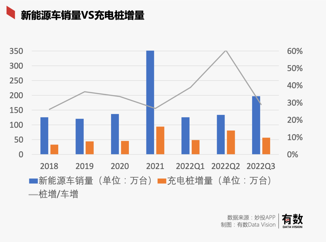 另外,充电桩增长的速度,远远赶不上新能源车的脚步。2021年,充电桩增量相比新能源车的销量,少了258万台。