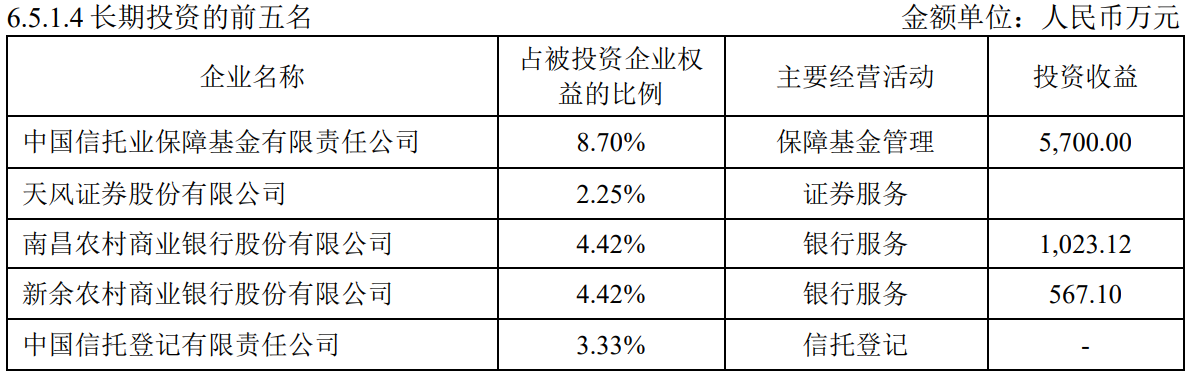 2021年年报显示,中航信托长期投资前五名中,还包括南昌农商行、新余农商行两家银行,以及天风证券一家券商。