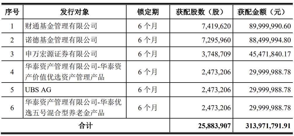 金海高科12月28日公布非公开发行股票发行情况报告书,此次非公开发行股票的发行价格为12.13元/股,发行股份数量2588.3907万股,募集资金总额约3.14亿元。此次发行对象最终确定为6家。财通基金管理有限公司、诺德基金管理有限公司、UBS AG等参投。