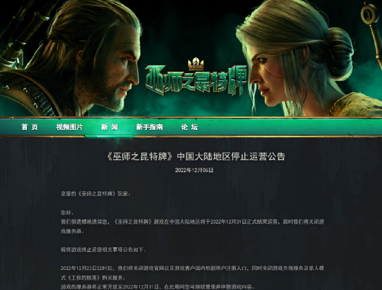 而进口版号中的《巫师之昆特牌》也是令人唏嘘的一个,就在2022年12月05日,官方刚刚宣布中国大陆地区将于2022年12月31日正式结束运营。