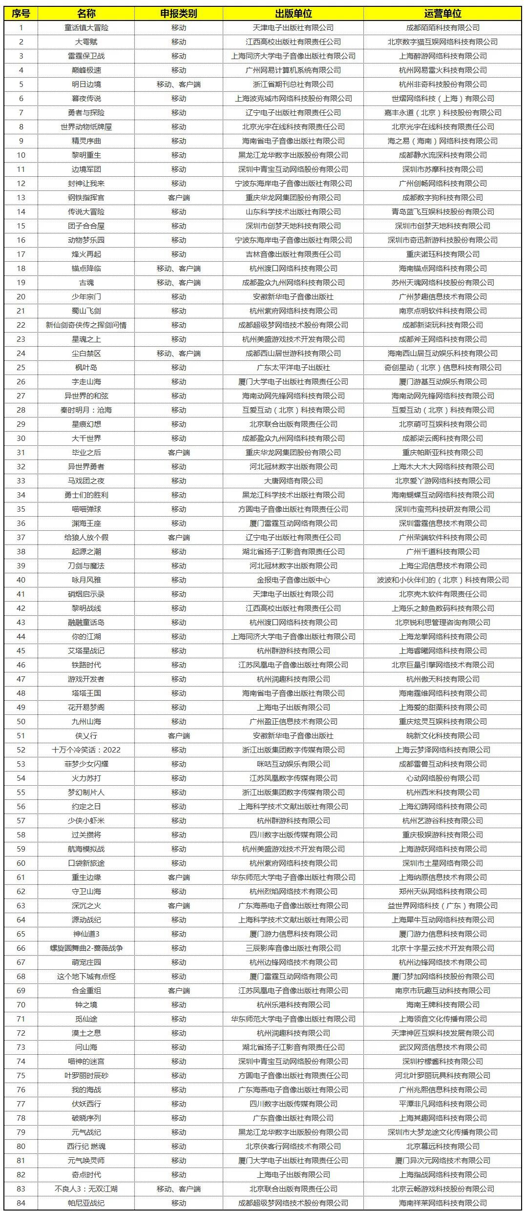 在本期的国产游戏版号中,共计发放84个,包括款77款移动游戏、7款客户端游戏,其中有5款游戏是申报了移动端和客户端双端版本,分别是《明日边境》、《锚点降临》、《古魂》、《尘白禁区》和《不良人3:无双江湖》。