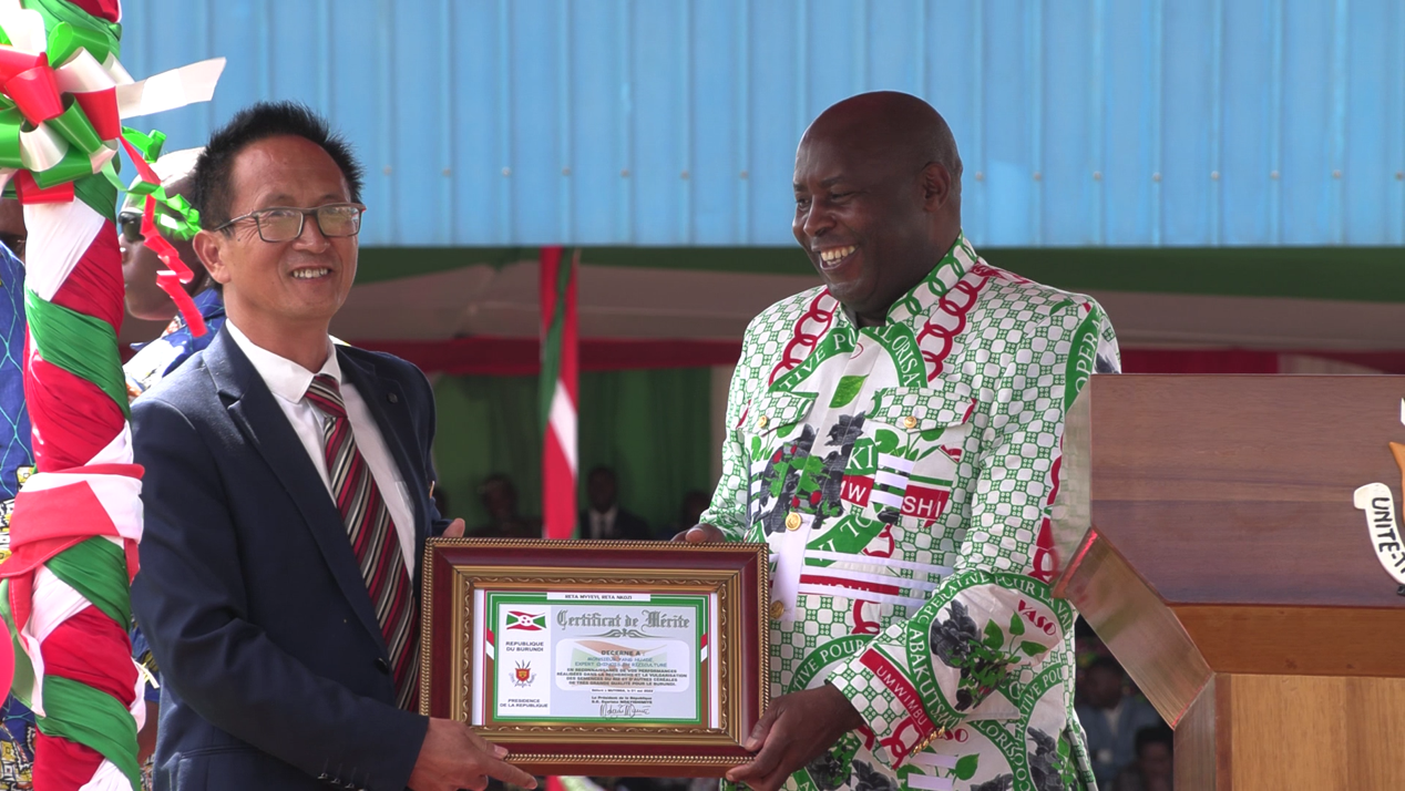 △布隆迪总统恩达伊施米耶向中国援布农业专家组组长杨华德颁发荣誉证书