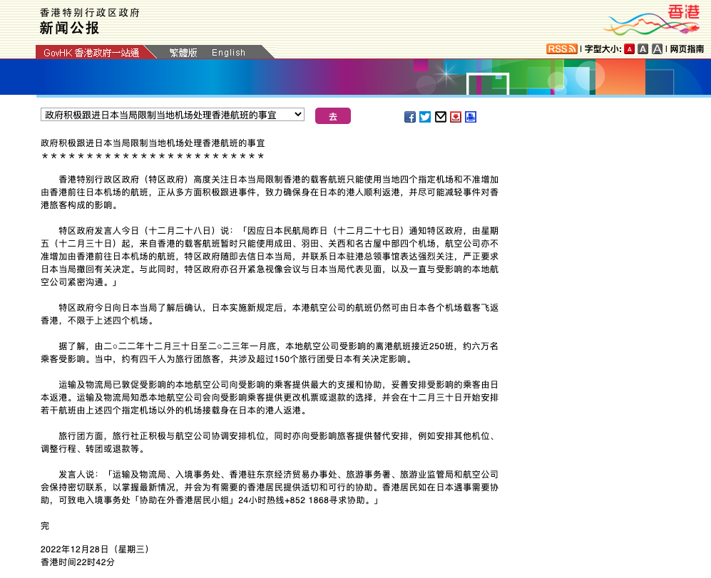 香港特区政府发言人今日(十二月二十八日)说:“因应日本民航局昨日(十二月二十七日)通知特区政府,由星期五(十二月三十日)起,来自香港的载客航班暂时只能使用成田、羽田、关西和名古屋中部四个机场,航空公司亦不准增加由香港前往日本机场的航班,特区政府随即去信日本当局,并联系日本驻港总领事馆表达强烈关注,严正要求日本当局撤回有关决定。与此同时,特区政府亦召开紧急视像会议与日本当局代表见面,以及一直与受影响的本地航空公司紧密沟通。”
