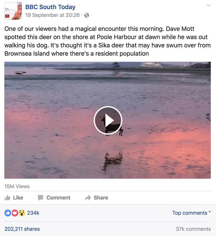 近日,BBC在其官方Facebook上发布了一支只有12秒的视频,却收获了一千五百万次播放次数、23万次点赞、20万次分享和将近4万条评论,而视频的内容只有一只小鹿在水面跳跃。