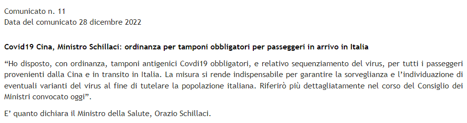 意大利卫生部网站12月28日发布声明称,意大利卫生部长斯基拉奇(Orazio Schillaci)表示,意大利对自中国入境的所有旅客强制实行新冠病毒快速检测,这项新措施亦适用于过境旅客。斯基拉奇称,他将在当地时间周三晚召开的意大利内阁会议上提供更详细的报告。