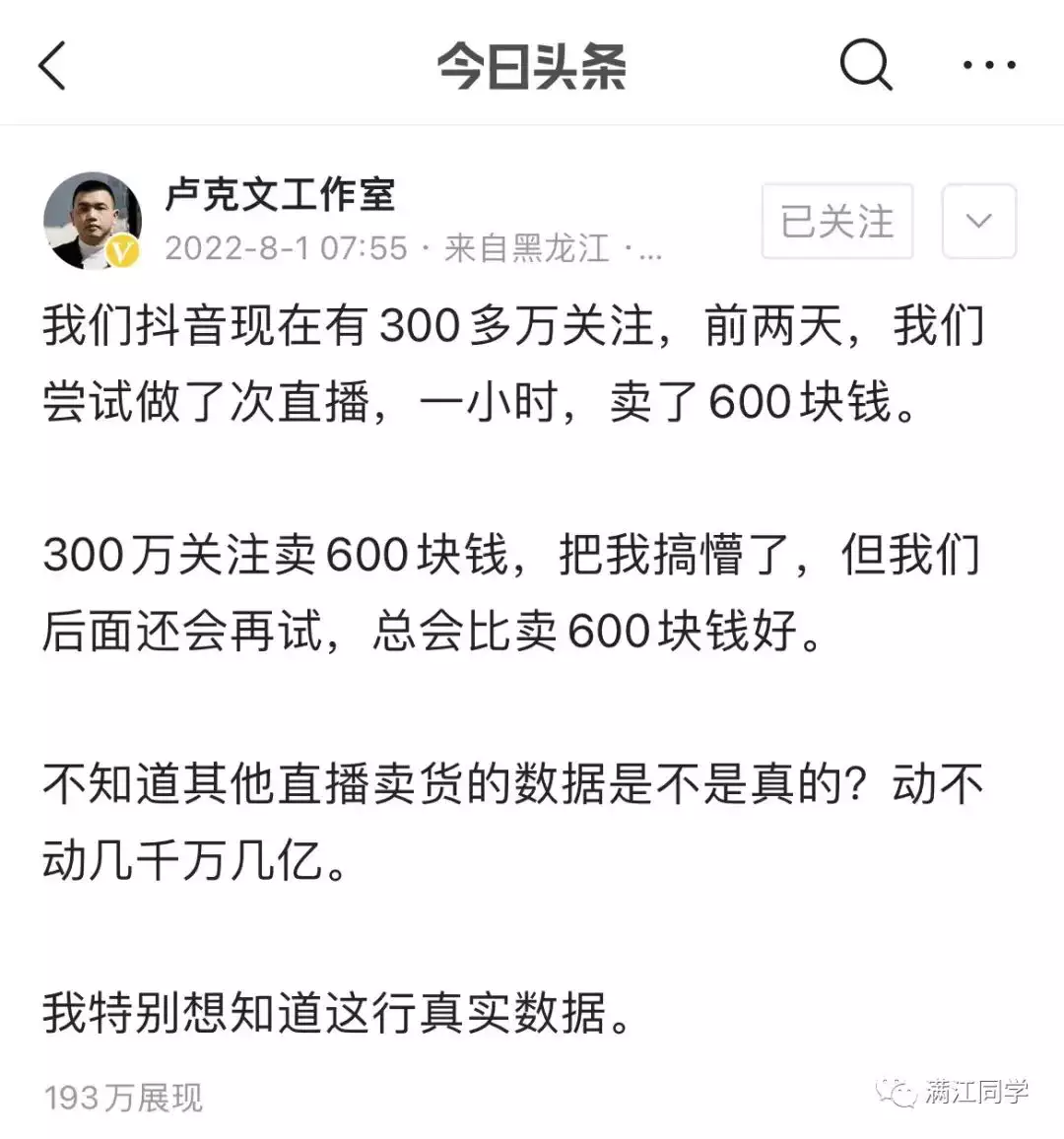 今年8月,知名大V卢克文发文称,自有抖音账号300万粉丝,尝试一场带货直播,1个小时卖了600块钱。