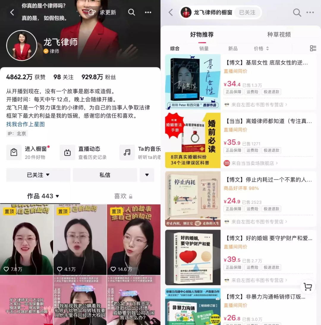 龙飞律师在连麦过后,也会直播带货,不过她选的产品客单价都很低,从9.9元到几十元不等,以零食、日用品、书籍为主。许多网友表示通过她的直播间和短视频,既满足了八卦心,又让获得了一些“专业知识”,下单就当是交学费了。下单了坚零食当做知识付费了。