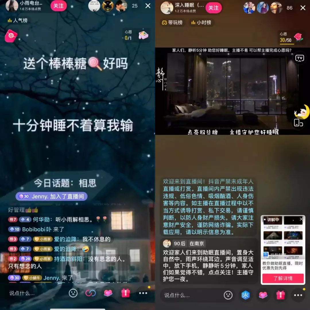 “助眠直播不能说话。没有点赞会判定直播间不受欢迎,有条件送颗小心心。”