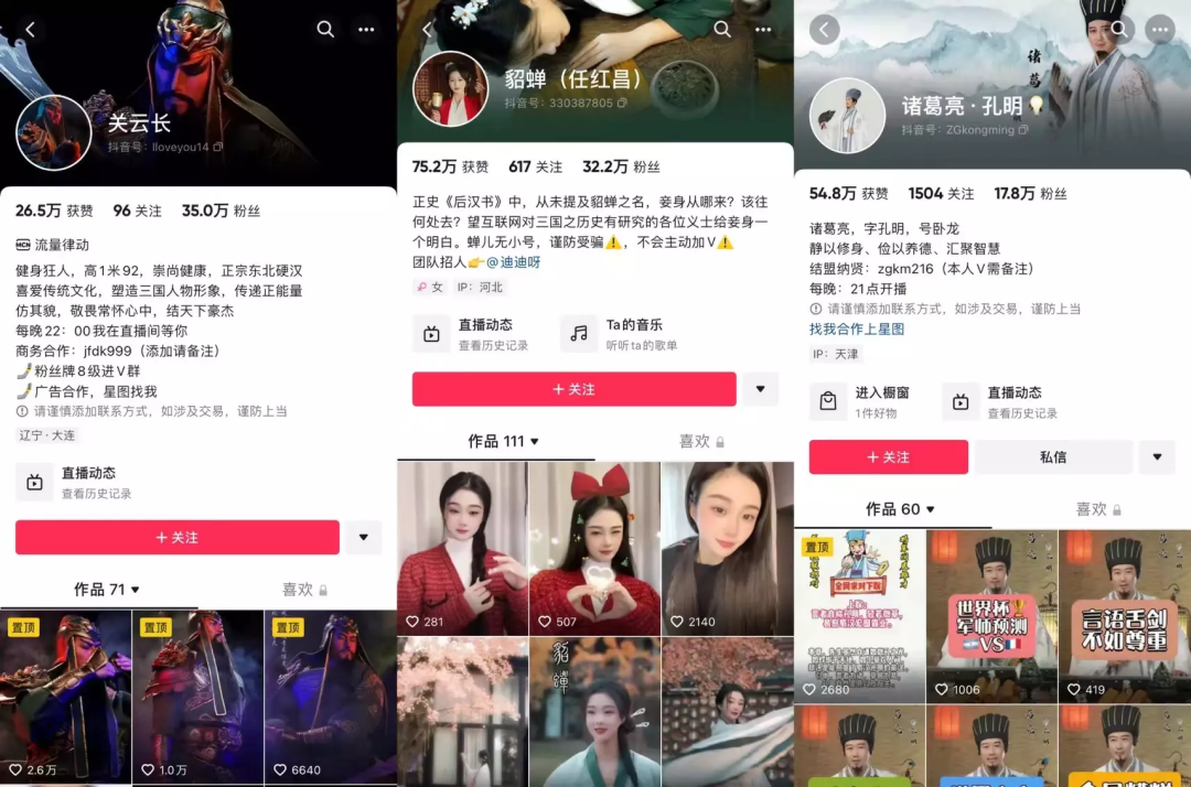 从今年2月开始,抖音上陆续出现三国人物账号,例如:关云长、貂蝉、诸葛亮. 孔明、赵子龍、吕布在横店等10多个同类型账号。
