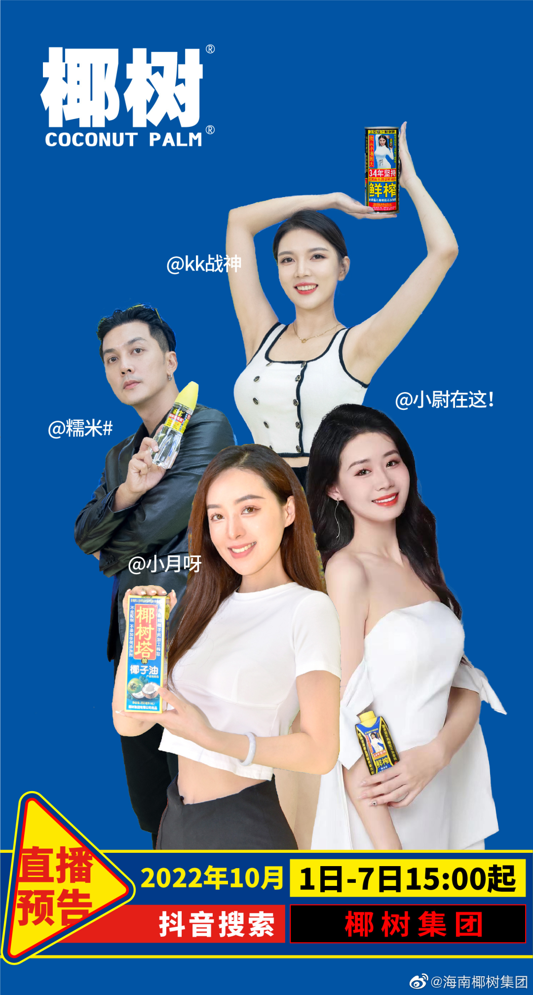 国庆小长假,椰树开启了直播带货,画风还是一如既往的稳定。男主播,是撞脸吴彦祖的@糯米#,女主播,@小月呀、@小尉在这!@kk战神、@璟如在三亚,同样颜值养眼。除了男帅女靓,可以发现,女主播都是和椰树椰汁代言人徐冬冬一样的大胸美女。