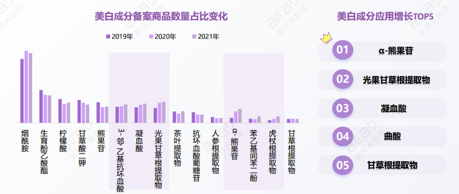 据美丽修行的《2022美白市场趋势指南》报告,从2019年到2021年,含有光果甘草根提取物的备案商品数量占比也在持续增长,并位列美白成分应用增长TOP2。