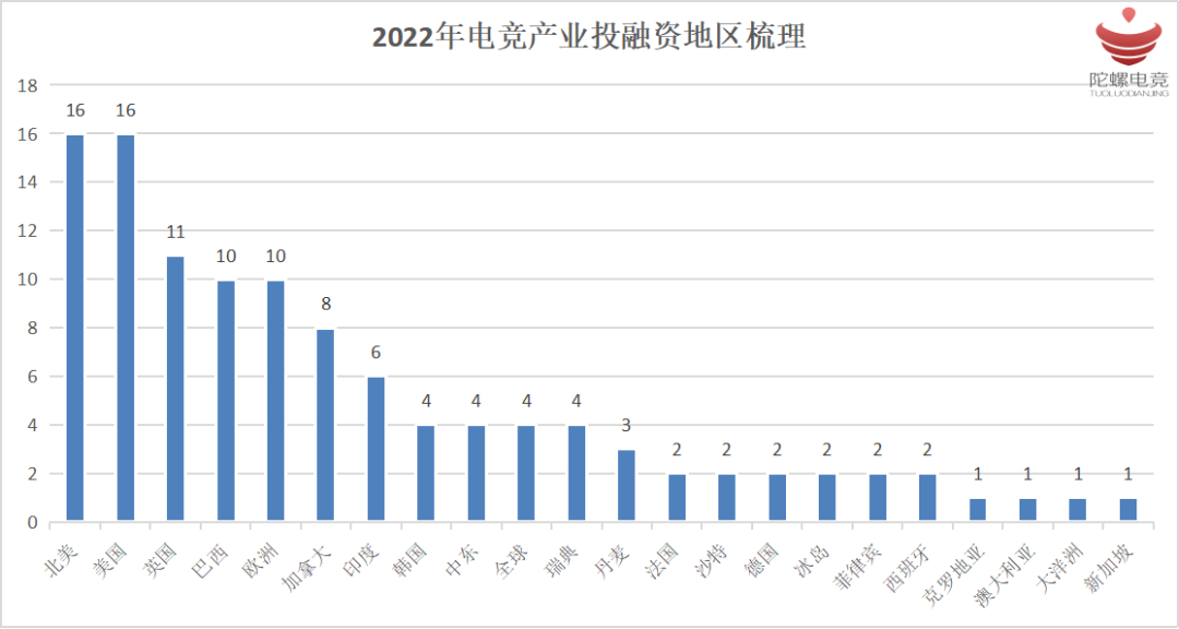 在2022年电竞产业投融资中,北美、欧洲地区仍是资本流动的主要市场,但同时可以看到,包括巴西、中东新兴市场也正在崛起,包括电竞用户数据的增长、电竞全产业链的构建等多个方面。