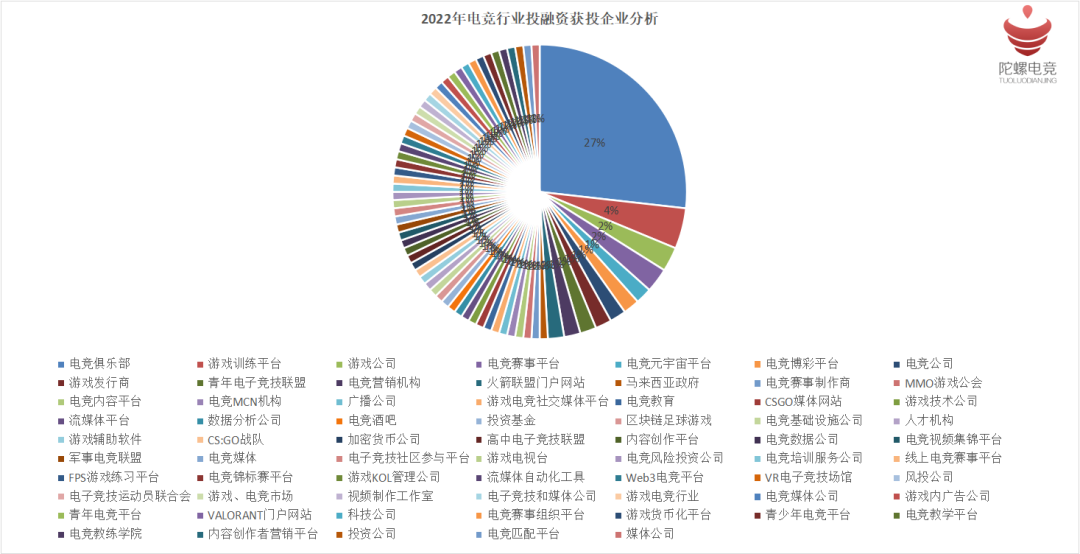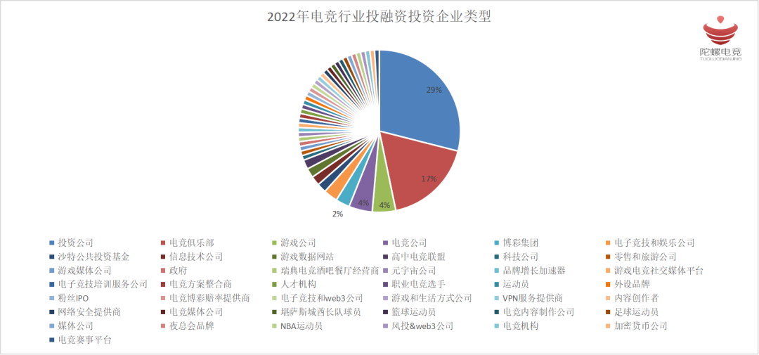 从今年电竞行业的投融资事件可以看到,资本市场对于电竞行业仍有着较高的关注度和布局力度。根据陀螺电竞的盘点,投资公司已经成为参与度最高的企业,占比达到总额的29%,其次为电竞俱乐部,占比为17%。