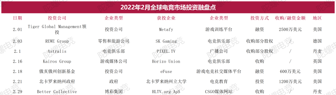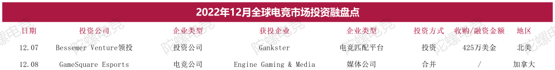 2022年1月-12月全球电竞行业投融资统计图表: