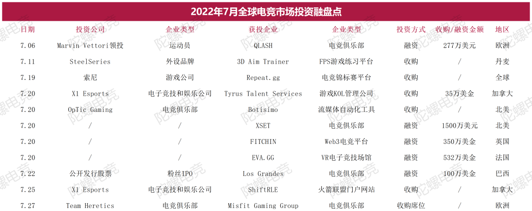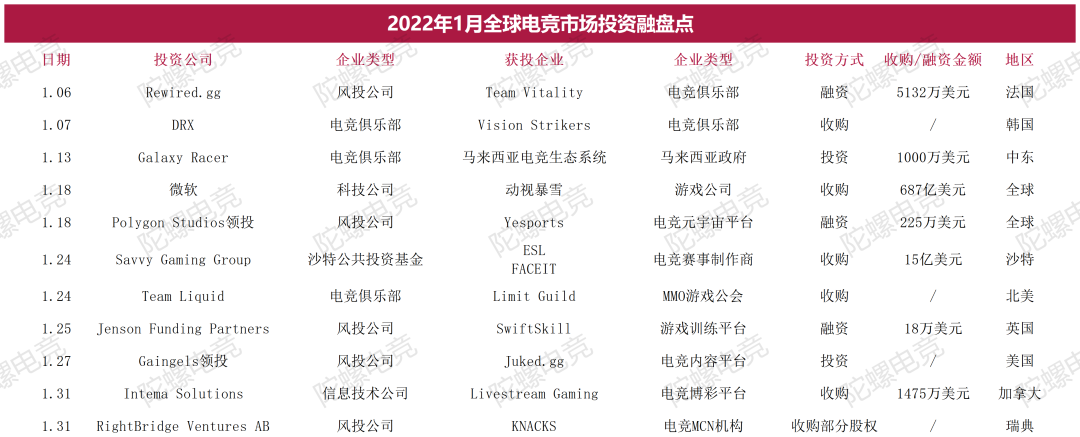 这也致使电竞市场的资本流动开始发生一些变化,其中包括针对巴西等新兴地区的收购开始成为趋势;具备变现能力的服务业务电竞公司成为投资的新方向等等。在这篇文章中,陀螺电竞梳理了2022年电竞行业的投融资事件,以此为出发点解析今年电竞产业的变化和趋势。