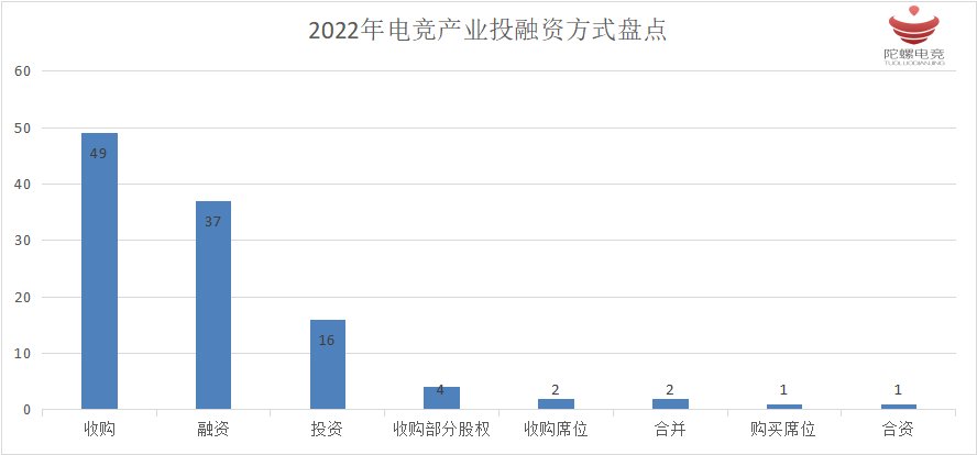 在投资方式上,收购是各大企业采用最多的方式,全年共有48起,占比达到总额42%;其次是电竞企业自主融资,全年为37起,占总额的33%。