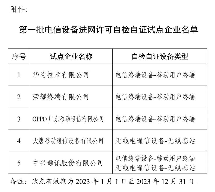 工信微报消息,为贯彻党的二十大关于深化“放管服”改革的决策部署,落实《国务院办公厅关于深化电子电器行业管理制度改革的意见》有关要求,进一步推动电信设备产业高质量发展,工业和信息化部近日公布第一批电信设备进网许可自检自证试点企业名单,华为技术有限公司等5家企业进入名单。