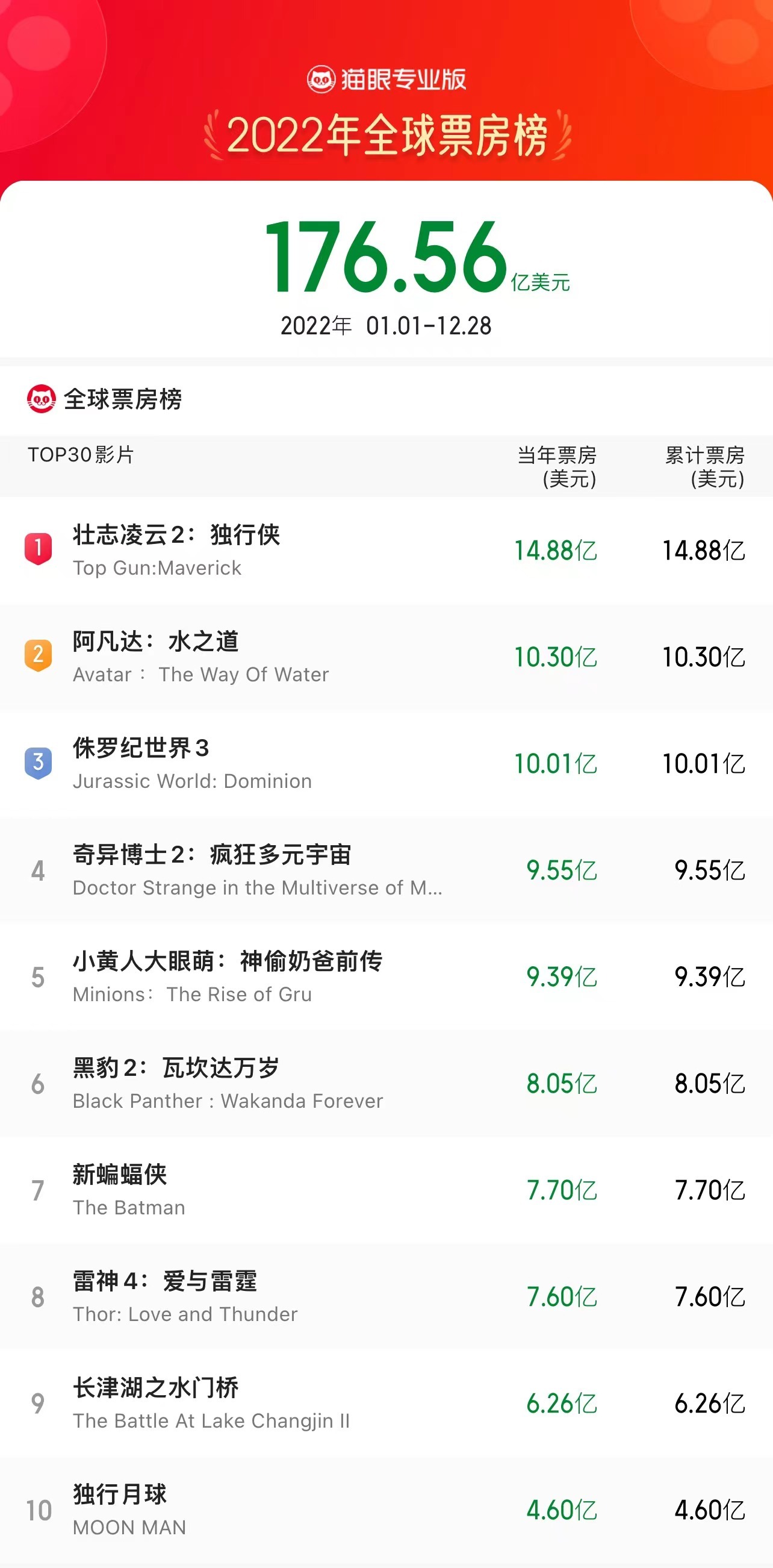 《阿凡达:水之道》成为2022年全球票房榜亚军