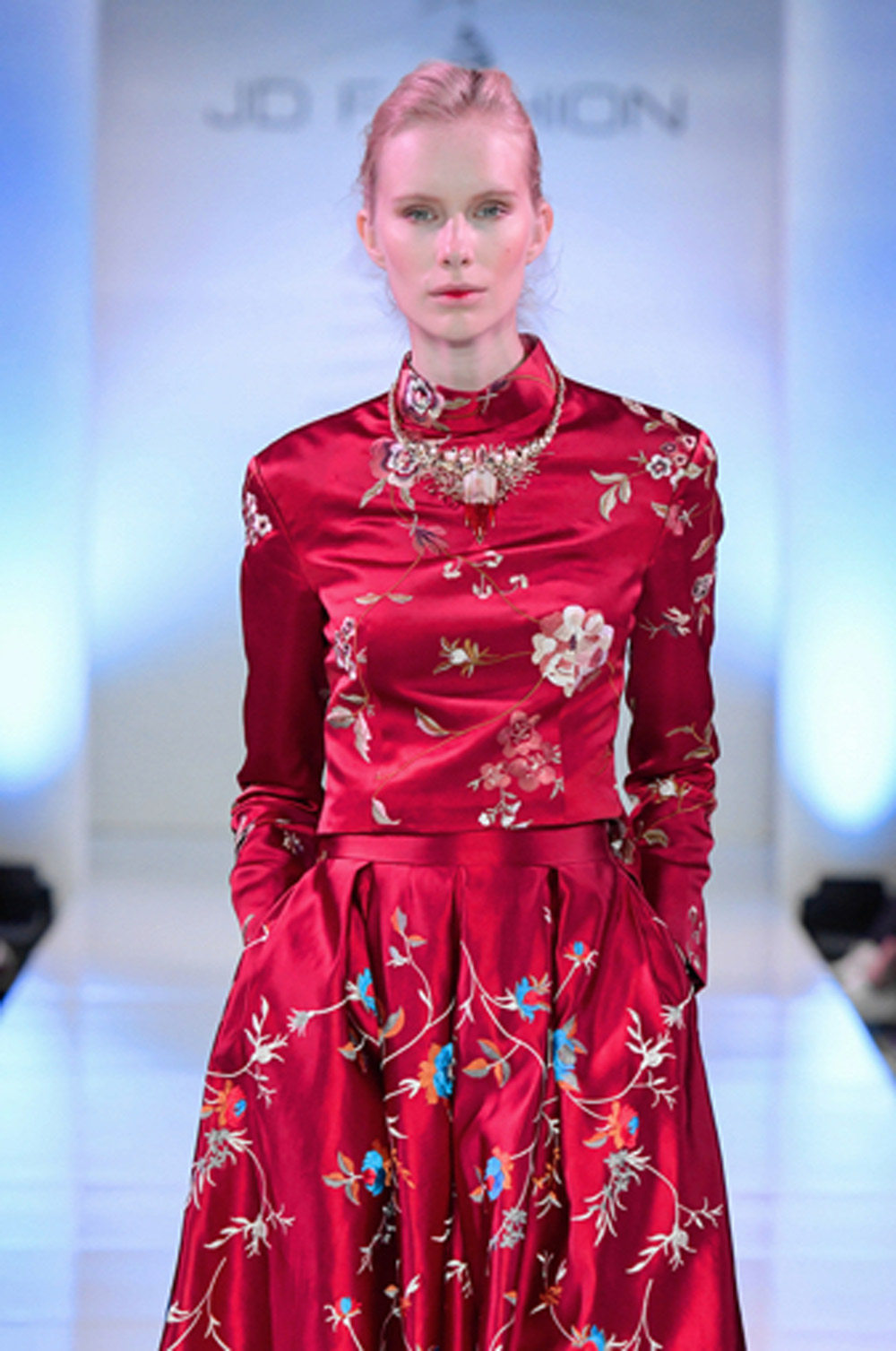 EVE de CINA(依文中国)是显而易见的中国风。EVE de CINA秀场作品从贵州苗族的生活汲取灵感,选择当地特色的花草为设计元素,显得清素淡雅。