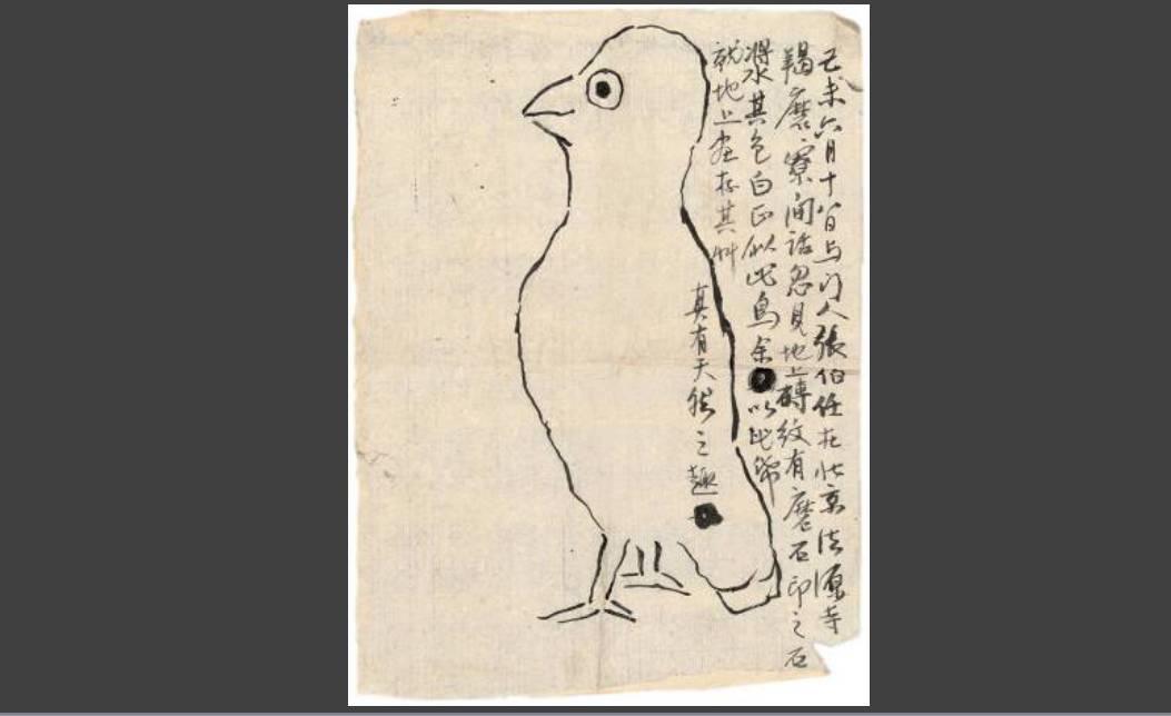 这张画是齐白石1919年,刚刚到北京的时候,他画的一张画。当时他寄居在南城的法源寺,他看见砖纹有一个磨印,很像只小鸟,他就画了这只小鸟。这只小鸟它身上写了六个字,叫“真有天然之趣”。