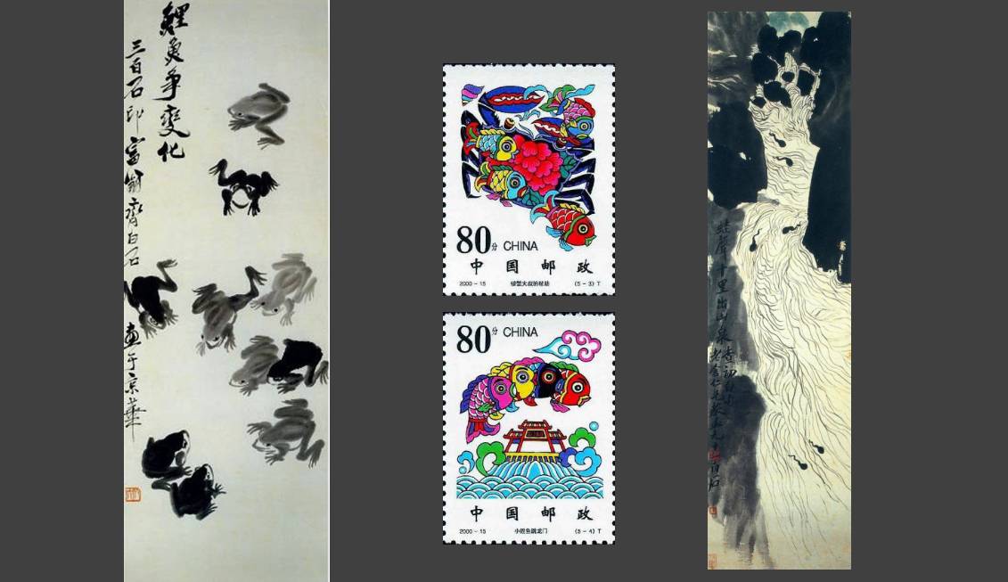 旁边还有一张画,叫“蛙声十里出山泉”,这张画是老舍先生旧藏。我小时候就在读这张画所有的释文,其中说齐白石太了不起了,他画了十里山溪,游过这十里山溪的蝌蚪,其实变了青蛙,蝌蚪是不叫的,青蛙是会叫的。而中国还有一个寓言叫“鲤鱼跳龙门”,“鲤鱼争变化”是不是有趣呢?加一个字就能理解了,“与”鲤鱼争变化,也就是蝌蚪变青蛙与鲤鱼变龙,也许是一个相争的关系。